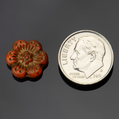 Wild Rose (14mm) Orange Opaline with Dark Bronze Wash, 10 Strands of 12 Beads per Unit *Last Unit Remaining*